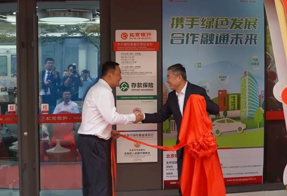 北京银行党委副书记钱华杰与大兴区经济和信息化局党组书记、局长王烨共同为“北京银行大兴国际氢能示范区支行” 揭牌,标志着这家专为氢能产业而生的银行网点正式启用—— 它不仅是一个金融服务窗口,更是示范区链接金融资源、服务企业发展的 “新纽带”。