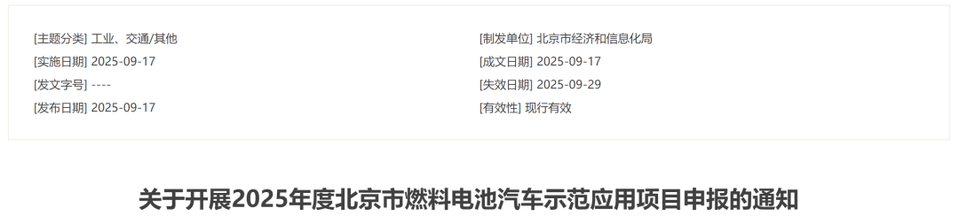 9月17日,北京经信局在官网发布了《关于开展2025年度北京市燃料电池汽车示范应用项目申报的通知》(以下简称《通知》)。